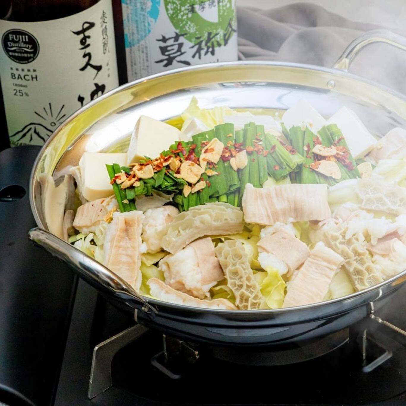 もつ鍋(旨辛味噌、醤油の2種類のスープから選べます)